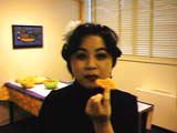 この日は特に出席もとらないので、興味のない人は来なくてもよかったらしい。いつもより人数が少ない。まずはカボチャ灯ろうの作り方を教わった。基本的には頭の部分に穴をあけ、中の種などを取り出し、あとは顔をくりぬいてろうそくを中に立てるだけ。いたって簡単だが、顔のデザインにこってしまうと時間もかかる。写真左は製作を終えた一団。パーティーといってもお昼にピザとジュースとお菓子がでるだけ。それでも1食分浮くのでしっかり食べた。写真右は取材に来た松本明子。に、そっくりなMi-Sun(仮名)。このときまで気付かなかったが瓜二つだ...。