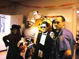 写真左は先生軍団。飲み食いが一段落したところで、学校の外へくりだした(おいおい嘘だろう...)。学校前で集合写真を撮った後、学校近辺を大行進。通行人、車の中から、店の中からよその人が笑いながら手をふってくれる。一団が道路を渡るときに、警官の格好をした先生が笛をふきながら車を止めてしまうなんて一幕もあった。そんなこともしゃれで許されてしまうのだ。写真右は先頭を歩く校長。なんの変装なんだかよく分かりません。なんか中高生位に戻った気分だった。