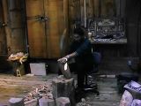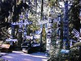 橋の向こう側は背の高い木が立ち並び(写真左)、薄暗い林になっている。池がぽつぽつとあって、魚が泳いでいるといった感じだ。園内はそんなに広く無く、30分もあれば十分に一周できる。再び吊り橋を渡って戻ると、そこではインディアンのおじさんがトーテムポール作りの実演をしていた(写真右)。そばに座り込んでしばらく見ていると、時折こっちを向いて、にっこりと愛想をふりまいてくれる。できあがるまではまだまだかかりそうだ(本当に最後まで作るんだか...)。
