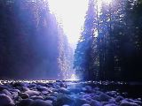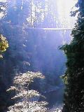 さて、園内を出てGrouse Mountainに向かうつもりだったが、横に鮭の孵化場の看板が目についた。Capilano Park(ここは無料)の中にあるようだ。時間もまだあるしよってみようとCapilano Parkに入った。ここも薄暗い森なのだが、公園地図を見るととてつもなく広い。さまよえど、さまよえど、いっこうに孵化場は見当たらない。しかも俺以外には人陰が無い。とりあえず時々看板を見るので公園の敷地内からは出ていないようだが...。そうこうしていると、ぽっと河原にでた(写真左)。静まり返っていて聞こえるのは川の流れる音と風になびく葉っぱのこすれる音だけ。遠くに釣りをしている人が見える。なんとなくのどかな気分になって、大きめの石の上に腰を下ろしていると後ろの方でガサガサと大きな音がした。まさか熊なんかでないよなと思いつつ辺りを見ていると、大きな犬が主人と一緒に散歩に来たようだ。川に飛び込み泳ぐ泳ぐ。主人が石を投げ込むとそこに向かってあっち行ったりこっち行ったり。犬も大変な主人を持ったものだ。